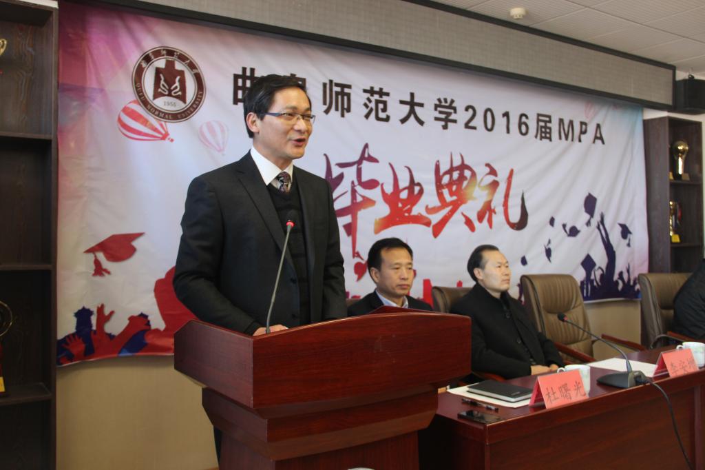 副校长夏云杰在典礼上致辞,肯定了学校MPA教育工作取得的成绩,向2016届毕业生表示祝贺并提出要求。夏云杰指出,自2010年被批准为全国第五批MPA培养单位以来,我校MPA教育工作发展迅速、成绩斐然,招生规模不断扩大,培养质量切实改善,社会认可度持续提升,多项教育教学指标在全国MPA办学单位特别是第五批院校中名列前茅。夏云杰向完成学业并顺利毕业的2016届MPA学员表示祝贺,希望学员们传承“学而不厌,诲人不倦”的校训精神,终身学习;在工作中秉承MPA的公共精神、恪守公共责任,踏实肯干;在为人处世上居上而不骄、处下而不忧,淡泊名利,在为人民服务的实践中实现人生价值。