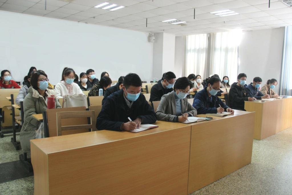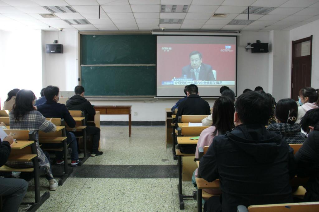 党委于JC614组织全体党员观看党的十九届六中全会新闻发布会。学院党委书记卢瑞霞,党委副书记张忠凯,副院长李增元等党委成员、教工党员、学生党员参加观看。