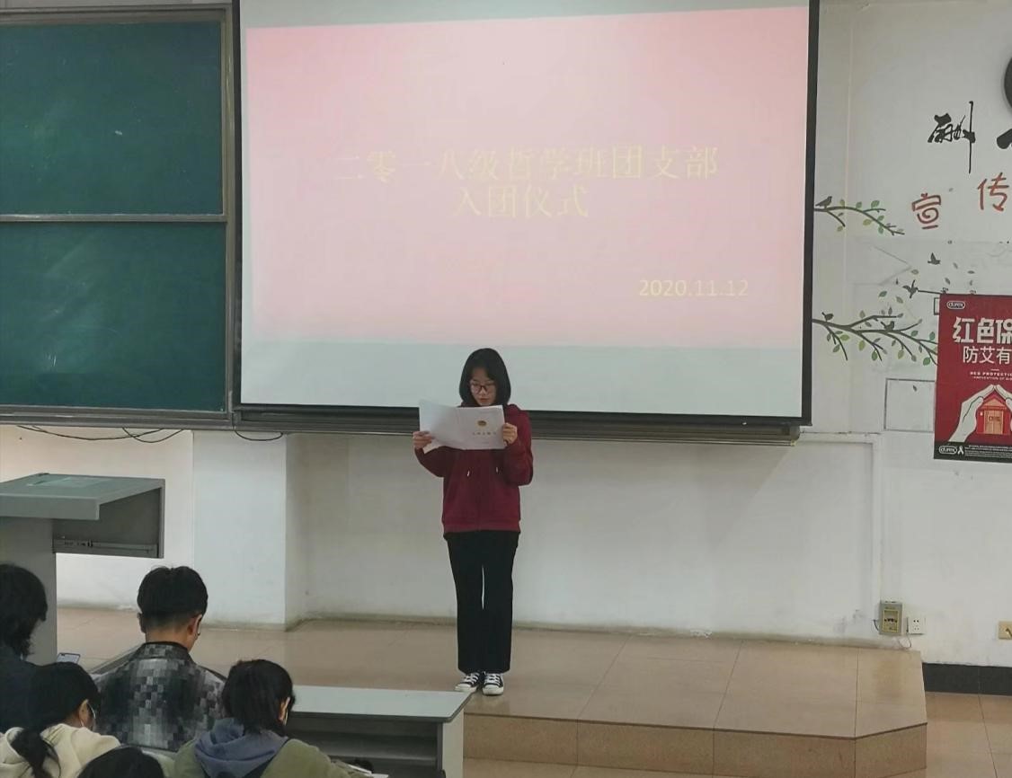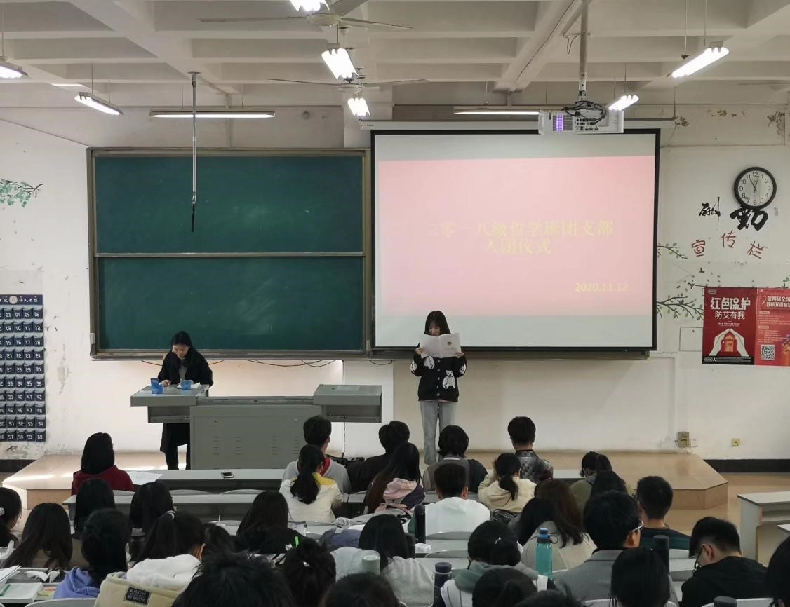 2018级哲学班团支部于JA302召开主题团日活动:团员纳新、重温入团誓词,本次活动由2018级哲学班团支书赵文康主持,2018级哲学班全体团员和团员发展对象参加。