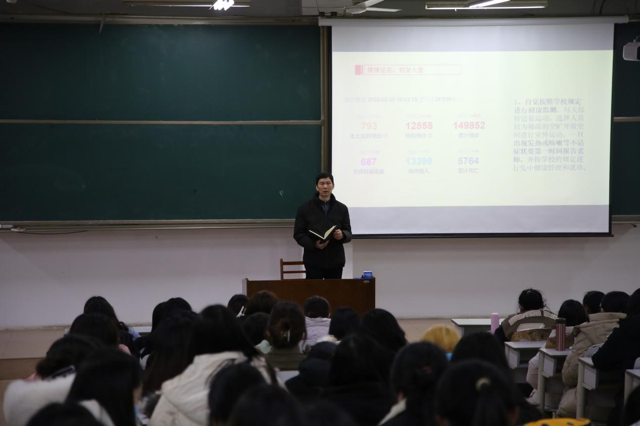本次会议围绕疫情防控、宿舍及公共场所防盗、人身安全、交通安全、爱国及思想政治教育几个方面进行,为同学们指明了新学期的奋斗方向。关于疫情防控,老师们首先强调防疫的重要性,然后提出防疫建议,叮嘱同学们自觉按照学校规定进行健康监测,非必要不出校,勤洗手,讲卫生,做好个人疫情防控。防盗方面主要围绕宿舍防盗和公共场所防盗两部分,并从思想重视、防范未然、身份证件、随手关门、不留外人、提高警惕六个角度为同学们提供防盗建议。其中,老师们特别强调“校园贷”问题,告诫同学们时刻提高警惕。对于人身安全问题,近年来大学生的人身侵害事件频繁发生,引起了大家的高度关注,老师们也为同学们提供了参考建议,无微不至。“道路千万条,安全第一条”,关于交通安全,老师们与同学们分享乘车安全常识。“中国式浪漫,冬奥会出彩”,最后,老师们以燃情之冬奥激励我们努力奋斗,不负韶华,赴冬日之约,行报国之志,并以北京2022年冬季奥林匹克运动会开幕式中“一鸽也不能少”的细节一幕,表达爱国之情,对学生进行思想政治教育。