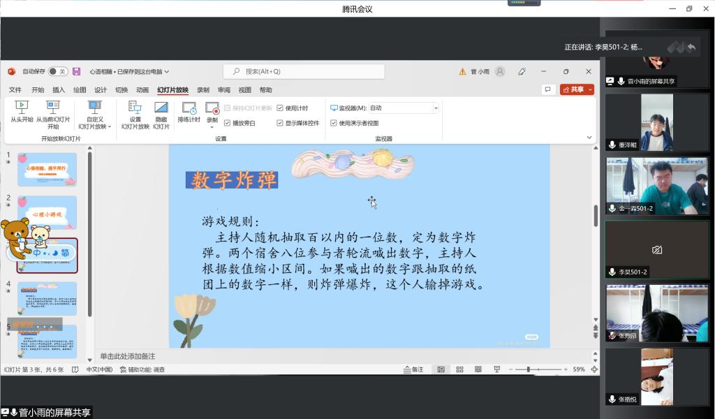 心相近,云相聚。接下来的心里小游戏环节内容丰富,形式多样,包括报数字喊名字、数字炸弹、你画我猜等。天南地北的同学们在一个个小游戏中积极表现,引得笑语满屏,带给大家积极的态度和正能量的氛围。