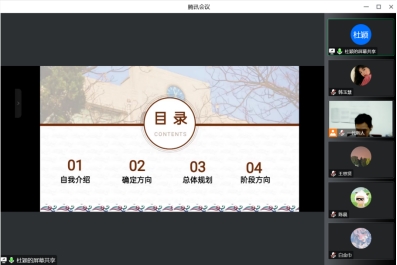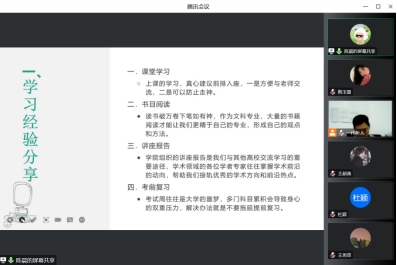 会议伊始,学长杜颖就“如何高质量度过大学四年”分享了自己的经验与感受。她表示,大学可分为四个时期,大一为定方向时期,定好考研或就业的大目标,继续将大目标细化成为若干小目标;大二是打基础的重要阶段,需要加强自律意识,自主学习,在学好专业知识的同时拓宽视野,做好职业规划;关键时期在大三,同学们应该朝着自己确定的方向去努力,而大四则是查漏补缺的一年。她强调“无论是选择哪一条道路,只要有勇气跨越便是人生路上重要的回忆”。