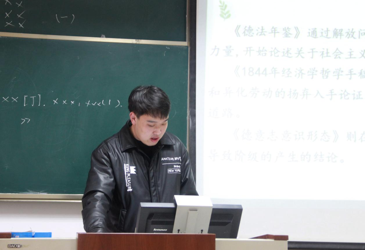 2022级张源儒同学从阶级斗争视角选读了《马克思恩格斯选集》,他详细阐述了阶级斗争以及马克思阶级理论诞生的背景、渊源和重要内容。同时他分享了《艳阳天》中所反映的阶级斗争表层现象下的深层矛盾及乡村伦理秩序,之后总结性阐述了阶级斗争是推动阶级社会发展的直接动力。