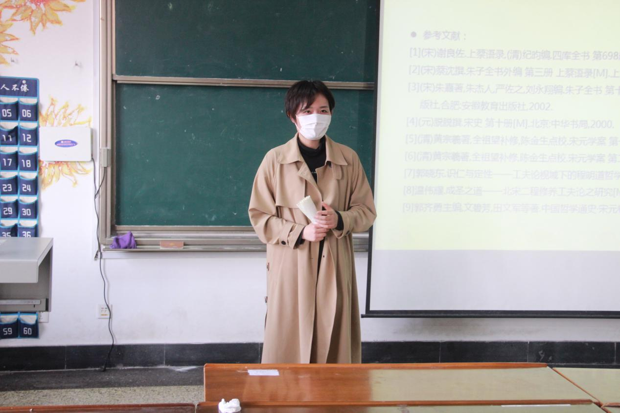 2021级薛原锦同学分享了谢良佐的《上蔡语录》,全书充分发挥了二程的客观唯心主义理学思想,也全面反映了谢良佐的理学思想,既是研究良佐理学思想及其师承渊源的重要资料,又是研究程朱理学发展不可或缺的原始文献。薛原锦同学从所穷理之来源、恕穷理之根本、所穷理之方法等方面对该书进行了详细介绍,使同学们对于谢良佐及其思想有了更为全面的认识。