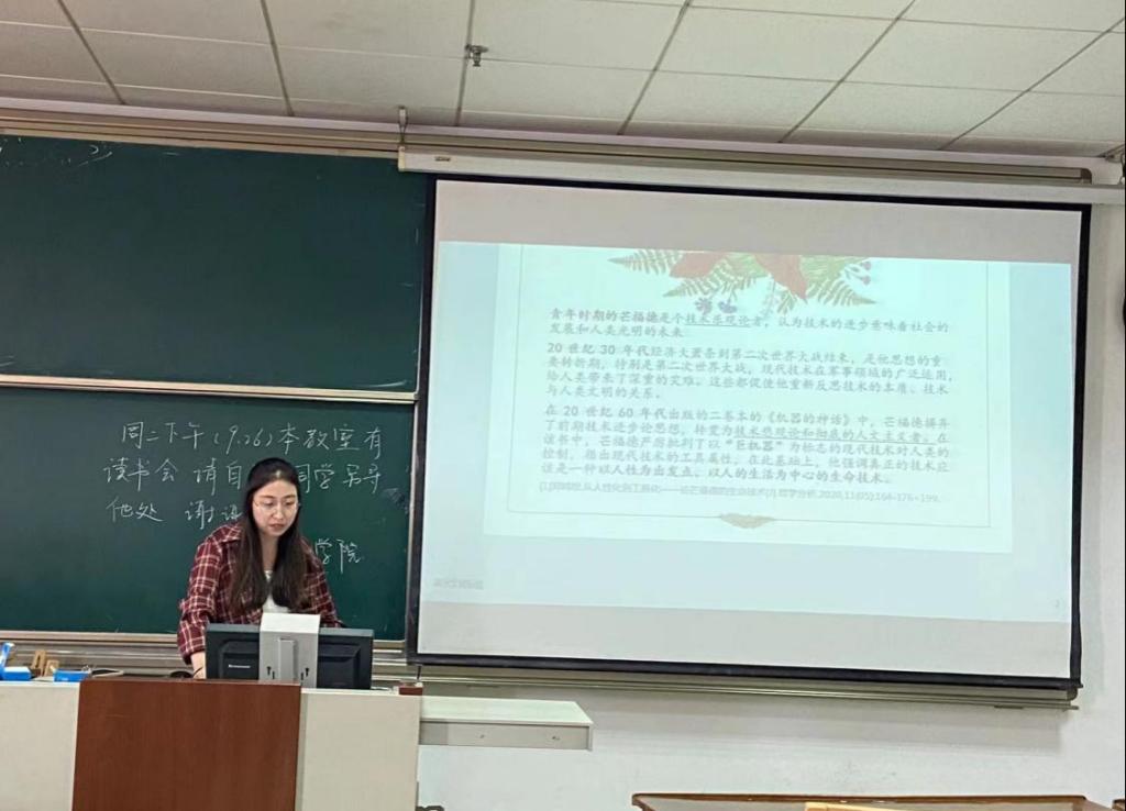 2022级刘伟佳同学分享的是芒福德的《技术与人的本性》,她阐述了在《机器的神话》中,芒福德强调真正的技术应该是一种以人性为出发点、以人的生活为中心的生命技术。基于芒福德人文主义机器哲学思想,她与同学们分享了关于在“巨机器”时代如何进行人的救赎的看法。