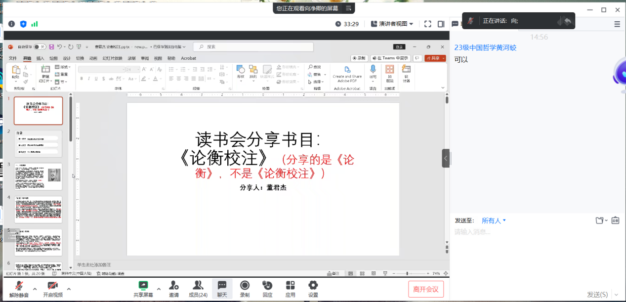 首先进行分享的是2023级董君杰同学,他分享的书目是《论衡校注》,他依次为大家介绍了这本书的写作背景、主要理论和阅读体会,最后提出“王充的自然观与其性命论之间是否存在矛盾”这个问题与大家讨论交流。