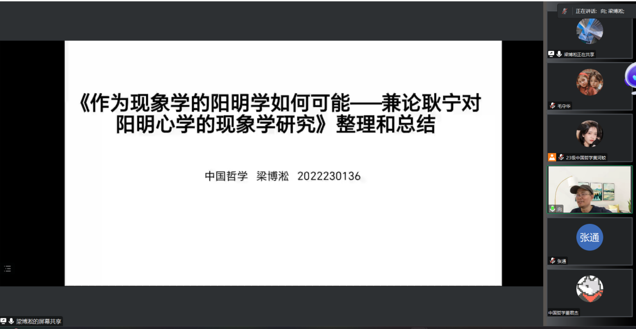 接下来2022级梁博淞同学分享的是《<作为现象学的阳明学如何可能——兼论耿宁对阳明心学的现象学研究>整理和总结》,他从原生现象:中国哲学中的“原初给予的直观”、“本体”与“原生现象”、“良知本体”之统摄作用三个方面介绍了这篇文章的内容,并着重讨论了现象学与阳明心学的共通性问题。