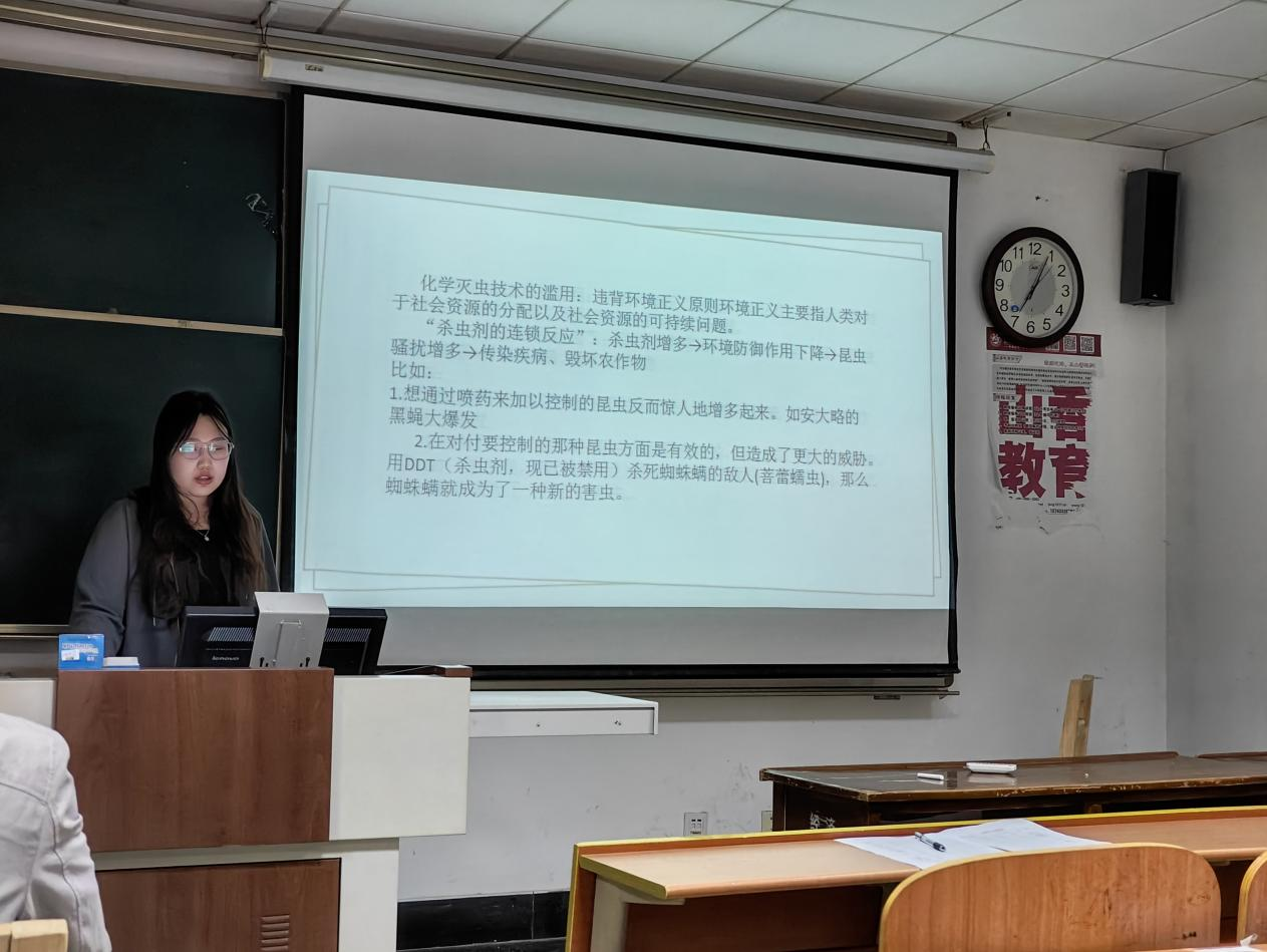 2022级韩玉杰同学就蕾切尔·卡逊《寂静的春天》的内容进行分享。首先说明了她对本书整体写作脉络的梳理,并分析书中作者所阐述的现代社会中发展所带来的污染问题与环境保护的冲突和矛盾,韩玉杰同学指出,“你怎样看待当今背景下的人与自然?”是我们每个人都应深刻反思的问题,当前社会飞速发展,但人类不能以牺牲环境为代价;在商业行为或生产活动中,也应当将环境问题中的伦理内涵作为发展方略中必不可少的一环。并根据自己的理解,分析了人这一社会主体应当与自然界达到平衡的关系。