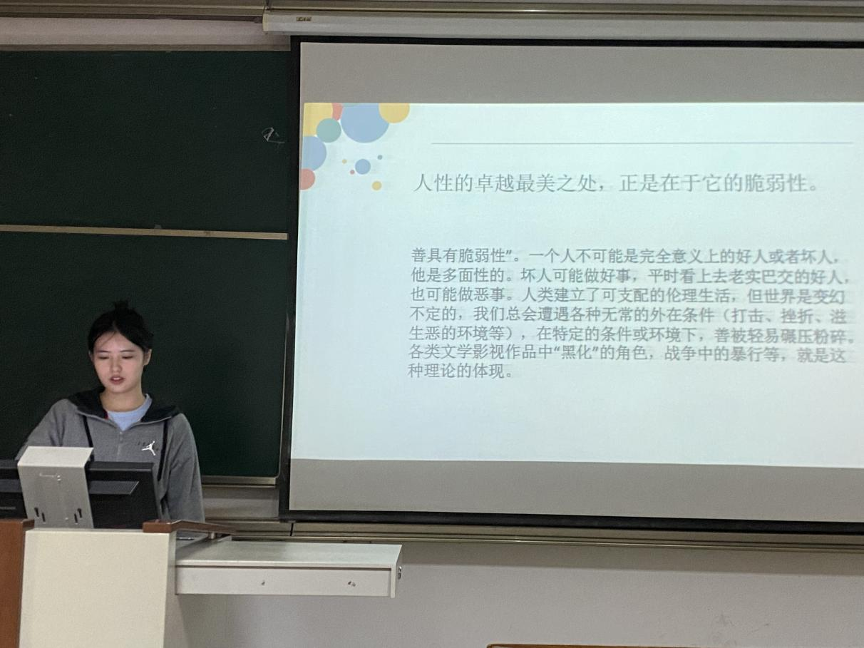 随后,2023级段继媛同学分享了关于《善的脆弱性》的读书心得。段继媛同学提出了关于此书的两个问题——“如果追求或实现外在善的活动必然受到运气的影响,那我们应该如何思考它们在好的人类生活中的位置?”以及“我们要不要因为运气就对好生活的因素不抱希望?”并加以解释,详细介绍了《善的脆弱性》在伦理学领域对于开展人的品格好坏研究的重要作用。