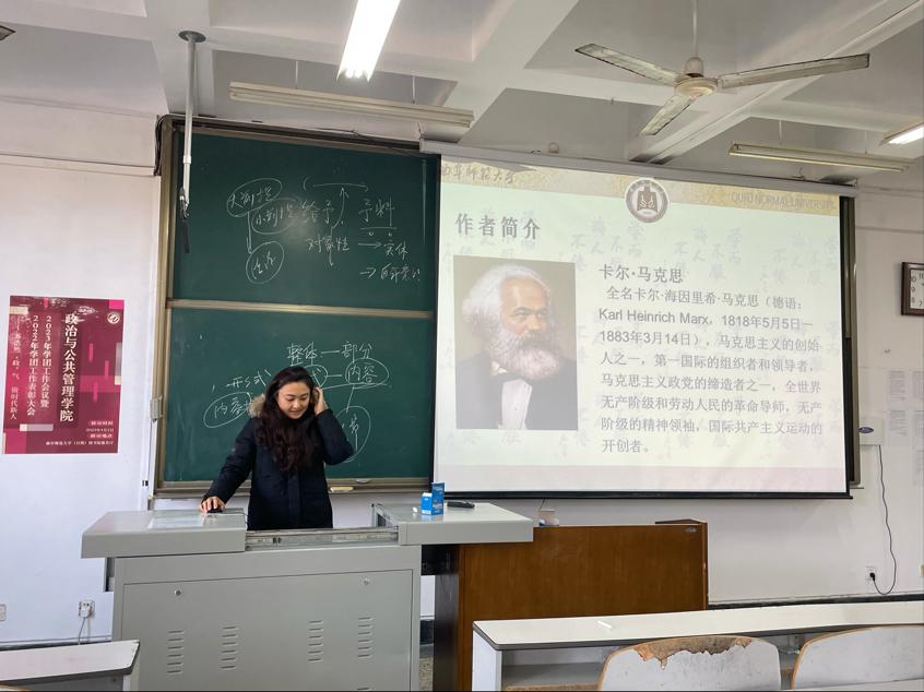 2023级李文婷同学分享的是马克思的《黑格尔法哲学批判》,她讲到在该书中,马克思揭露了黑格尔思辨哲学的神秘主义,指出具有哲学意义的“不是事物本身的逻辑,而是逻辑本身的事物”,得出了市民社会决定政治国家的著名结论;阐明了人民创造国家的思想,提出必须经过真正的革命来建立新国家的观点。最后她针对21世纪的今天是否实现了“人的解放”提出问题并分享自己的观点。