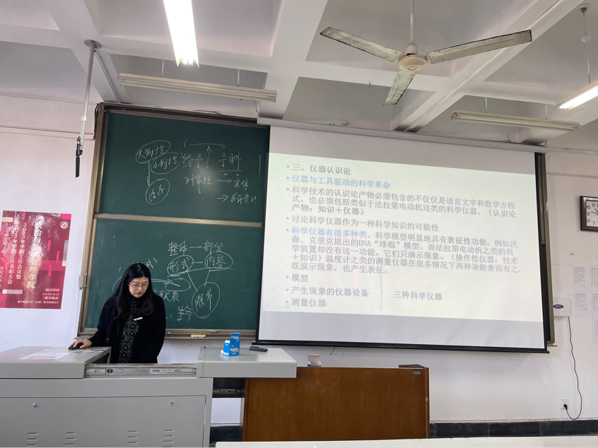 2022级王唯同学分享的是《器物知识:一种科学仪器哲学》一书,她讲到从仪器或工艺的角度来理解科学和技术的物质性产物,其路径是对科学仪器进行物质性的认识论考察。她提到,书中作者认为器物与语言具有同等地位,也是理解知识的核心,仪器自身就是科学理论,负载着知识,可以发展出独立的知识体系。 科学仪器不仅仅是科学思想基础层次上的,它与那些理解世界的重要的理论处于同一个层次。最后,她针对科学仪器能保证科学知识的客观性吗一问给予解答并与同学们进行交流讨论。