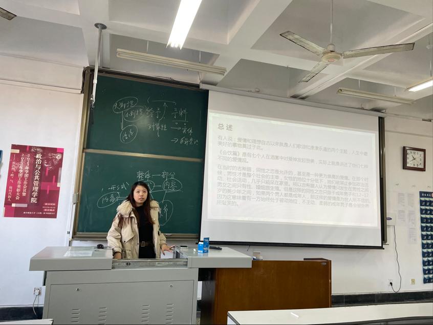 2023级李雯雯同学分享的是柏拉图的《会饮篇》,她讲到《会饮篇》是关于柏拉图中期理念论和美学思想的一篇重要对话。对话主要由七篇对爱神的颂辞组成,这七篇颂辞层层深入,讨论的主题从对爱神的赞美转向对爱的本质的追问,又提升到爱神帮助之下灵魂对知识的求索,最终引至美的理念引导之下灵魂向纯粹理念世界的不断攀升。她针对“你理解的爱是什么“和“苏格拉底对爱的理解”两个问题进行分析并与同学们进行讨论。