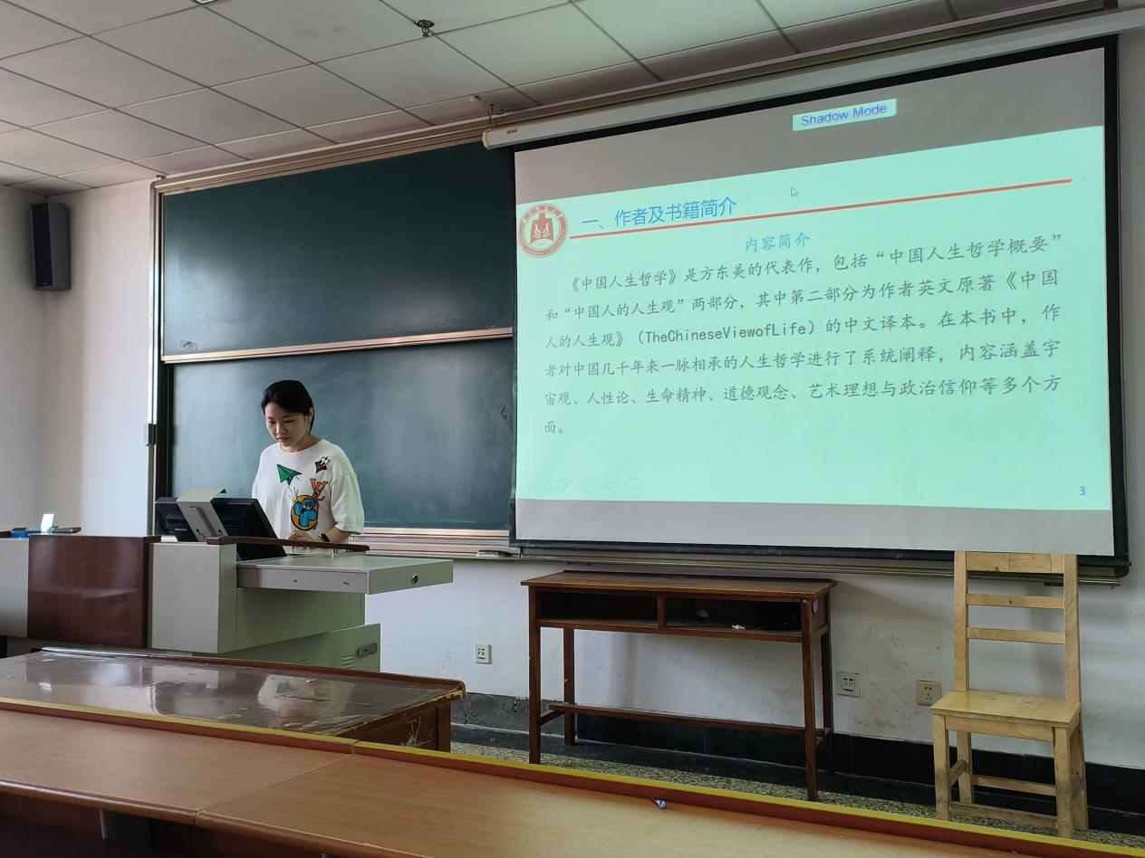 2023级黄河蛟同学分享方东美的《中国人生哲学》一书,包括“中国人生哲学概要”和“中国人的人生观”两部。她指出,作者对中国几千年来一脉相承的人生哲学进行了系统阐释,内容涵盖宇宙观、人性论、生命精神、道德观念、艺术理想与政治信仰等多个方面。