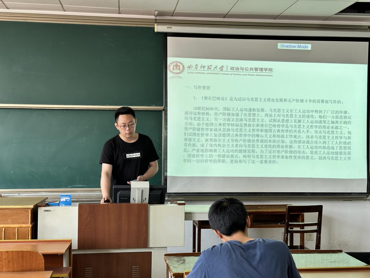 2023级张书畅同学就《路德维希·费尔巴哈和德国古典哲学的终结》的内容进行分享,通过对本书的整体性概括和重点部分的凝练总结,他提出了问题:“一切事物都是不断变化发展的”这句话可否作为马哲的永恒真理?引发了同学们的思考。
