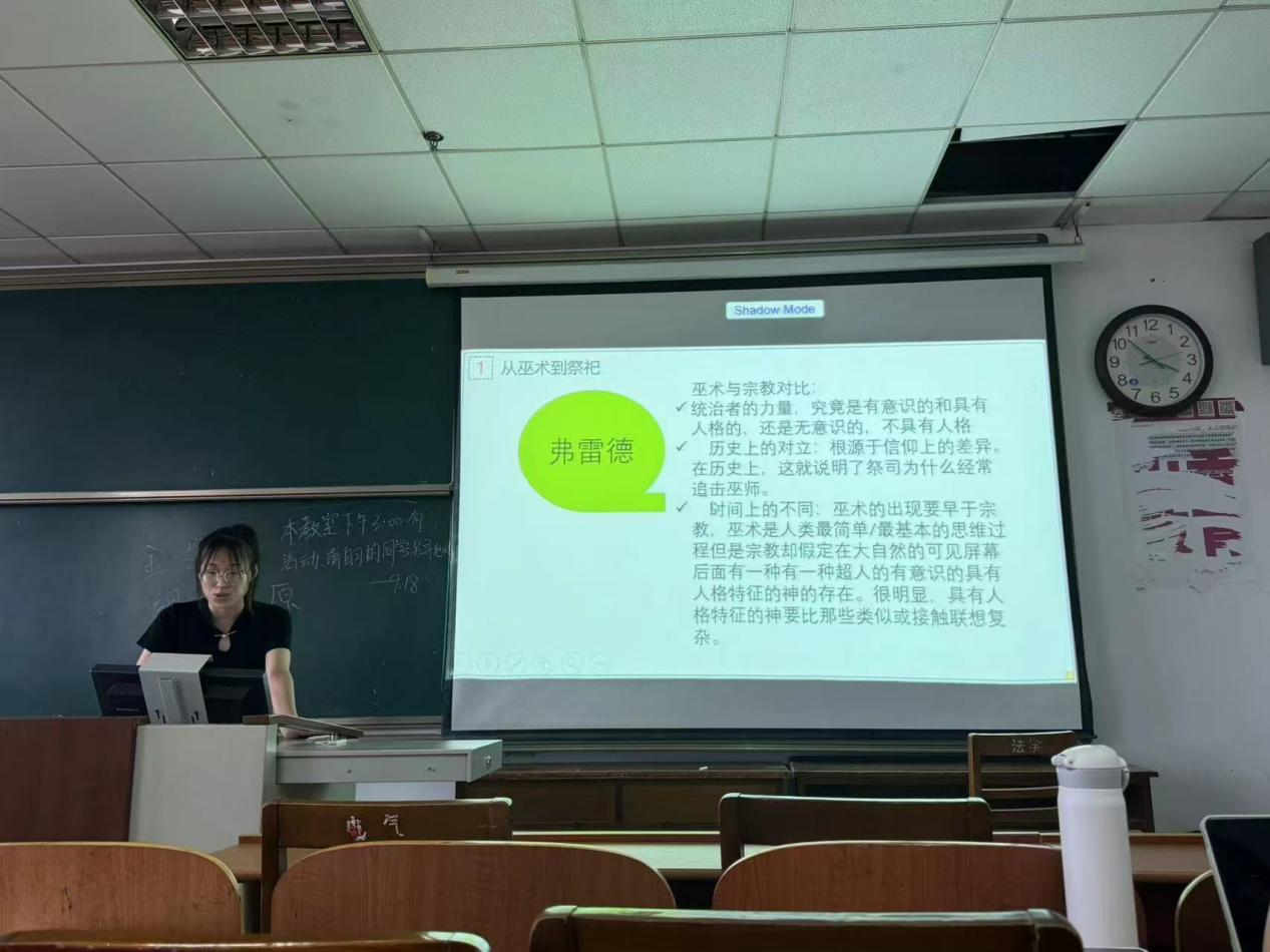 24级李云秀同学以原始思想基础的情感的统一性为切入点分享《古代宗教与伦理—儒家思想问题的根源》一书,为了说明作为原始思想基础的情感的统一性,卡西尔提出了“生命一体化”的观念。随后,她就“生命一体化”的观念与大家进行互动交流。