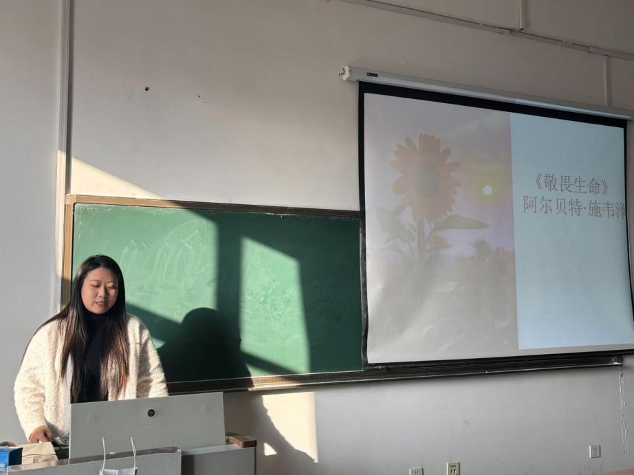 2024级秦汉茹同学分享的书目是阿尔贝特•施韦泽的《敬畏生命》,这是一篇充满人道主义精神的哲学著作,强调对一切生命的尊重和关怀。施韦泽提出的"敬畏生命"伦理思想,超越了人类中心主义,呼吁我们关心所有生物的生存与幸福。最后,秦汉茹同学提出的问题是——“对待生命的看法是什么?”,这个问题与个体的关系十分密切,引起了同学们的踊跃回答,她对于这个问题也有一些见解,分为三点回答:生命是宝贵的、生命是有目的的,生命是短暂的。以此来告诉我们要敬畏生命。