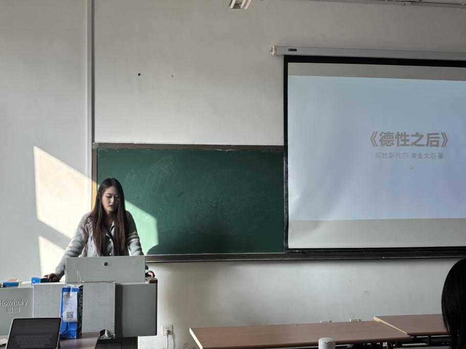 首先,2023级于疆霪同学就《德性之后》一书的内容进行分享。麦金太尔的《德性之后》探讨了现代社会中道德话语的混乱和危机,强调道德判断缺乏一致性和共同基础。于疆霪同学对全书进行了整体性的概括分享和重点部分的凝练总结,她向大家提出问题——“如何理解麦金太尔的美德观?”这一问题,引起了在场同学们的积极讨论,启发了同学们不同层面的思考。