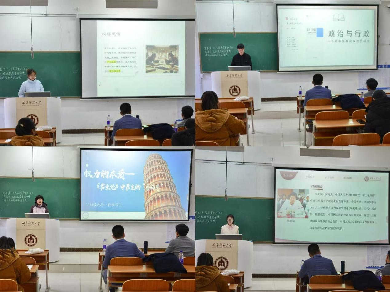 本次活动共有六个参赛小组,各小组代表通过PPT演讲的方式分享《中国政治思想史》、《君主论》、《政治与行政》等经典著作。从作者简介、内容概述、主题思想等诸多方面,对全书内容进行了分析,将政治与人性、国际关系等问题作为切入点,深入剖析了书籍内容,并结合个人理解,生动地表达自己的感悟。