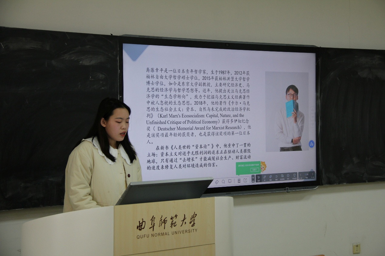 2023级宫晓云同学分享的是《人类世的资本论》,她分享了“贫穷的资本主义和富裕的共产主义”、“去增长共产主义“等概念,提出了人类克服“人类世”危机的最佳途径是什么、每个人应如何做的问题。