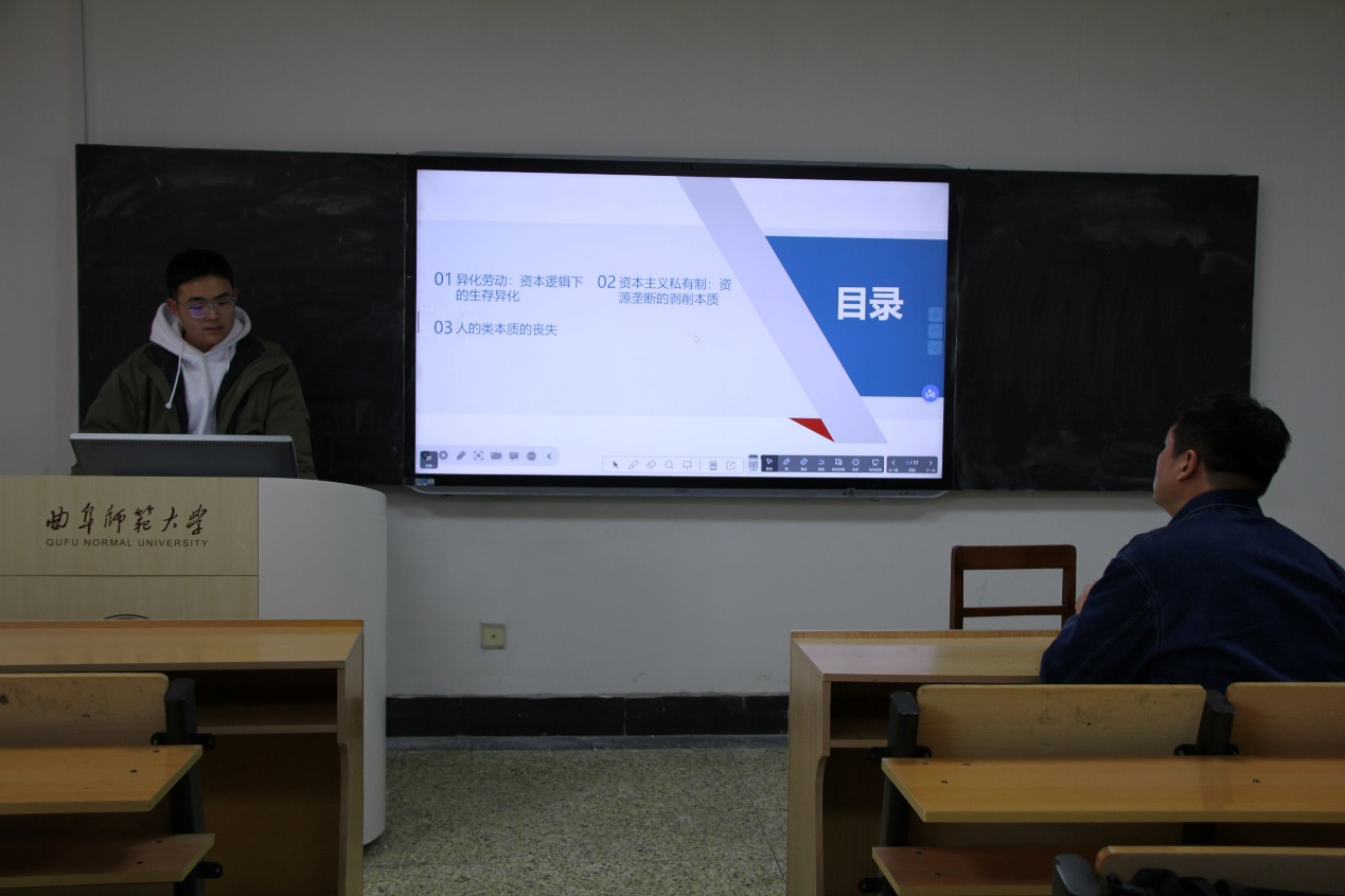 2024级董子铭同学分享的是《1844年经济学哲学手稿》,他通过将书中内容与时政相联系,解释了异化、私有制和类本质等核心观点,并分析了资本逻辑下的生存异化,以及通过不同国家制度的比较展示了资本主义矛盾的当代表现。