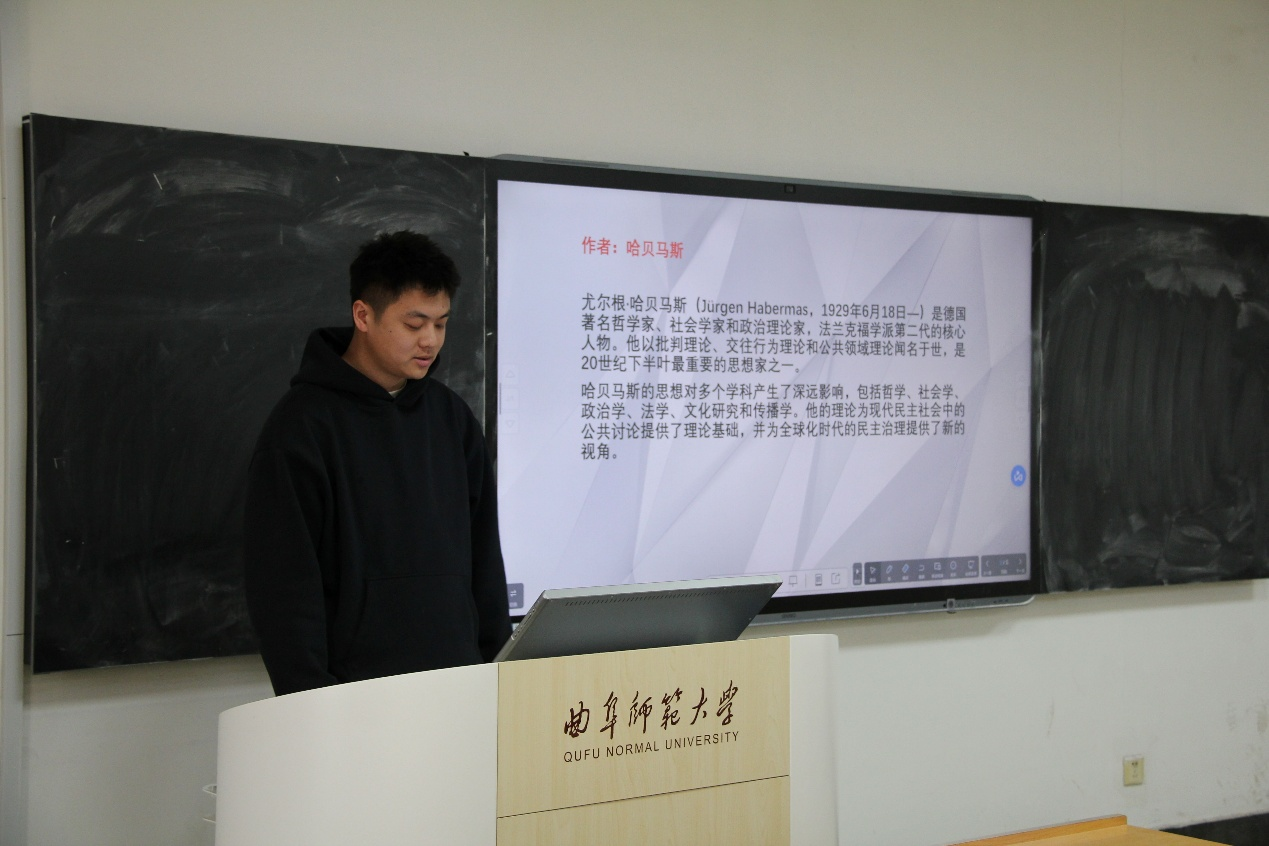 2024级陈永尚同学分享的是《作为意识形态的技术和科学》,他分享了哈贝马斯的交往行为理论和公共领域理论,并提出了哈贝马斯和马克思的科学技术观有何不同的问题,引发了同学们的思考。