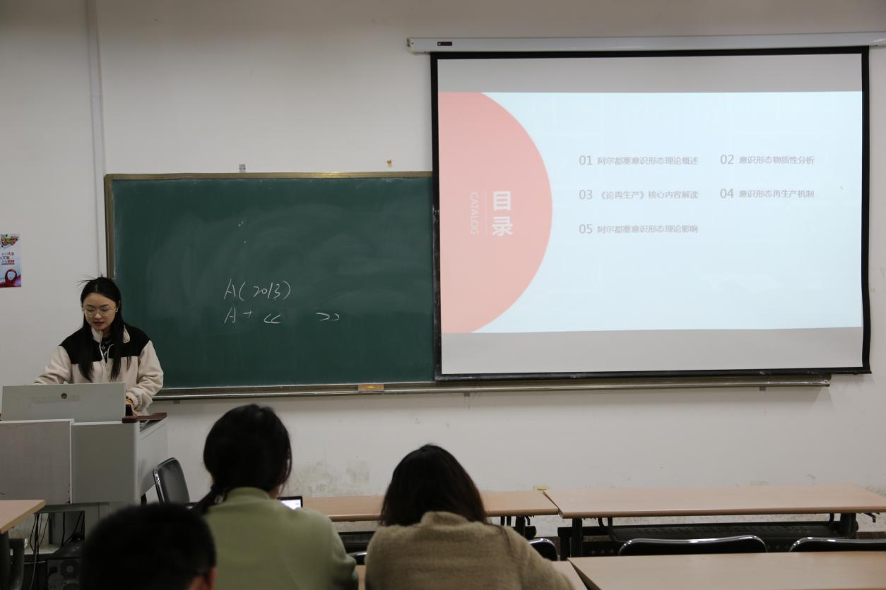 2023级宋雪晴同学分享的是阿尔都塞《论再生产》,她从阿尔都塞意识形态理论概述、《论再生产》核心内容解读、阿尔都塞意识形态理论影响等方面进行解读,提出了阿尔都塞意识形态思想探究与资本主义生产关系再生产的问题。