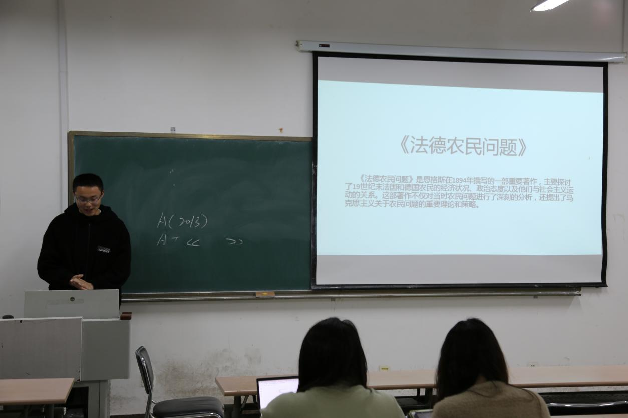 2024级凌浩同学分享的是《法德农民问题》,他从创作背景、主要内容等方面解读文本,提出了恩格斯的小农理论对当下乡村振兴有何启示的问题。
