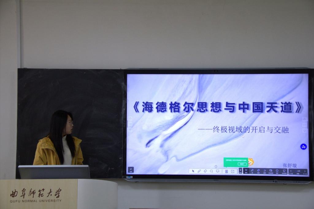 2024级张舒璇同学分享的是《海德格尔思想与中国天道——终极视域的开启与交融》,她阐述了海德格尔思想与中国天道观的对话带给她的启发,并认为儒家天道观与海德格尔的“缘构发生”在存在论角度上存在相通点,并提出了二者何以在相互融合的基础上探讨存在话题的问题。