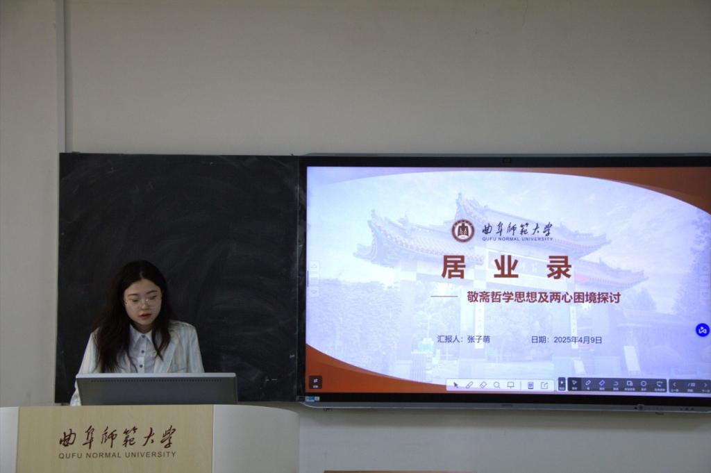 2023级张子萌同学分享的是《居业录》,她认为作者的困境是程朱理学体系在明代发展的新阶段,同时结合了陈白沙"静坐中养出端倪"的工夫简化和王阳明"心即理"的本体革命,提出了如何理解“敬斋之两心困境”的问题。