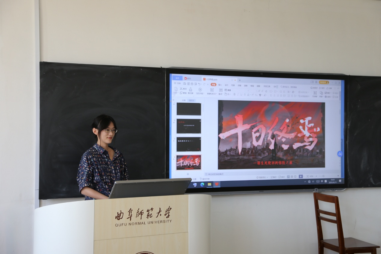 2024级宋忠莉同学分享了《十日终焉》一书,重点指出书中通过极端情境展现人性在面临终极危机时的复杂状态。特别分析了角色在绝境中做出不同抉择背后的道德困境与哲学考虑,并提出“当世界走向终结,人类坚守的道德准则和价值观念是否还有意义”的问题。