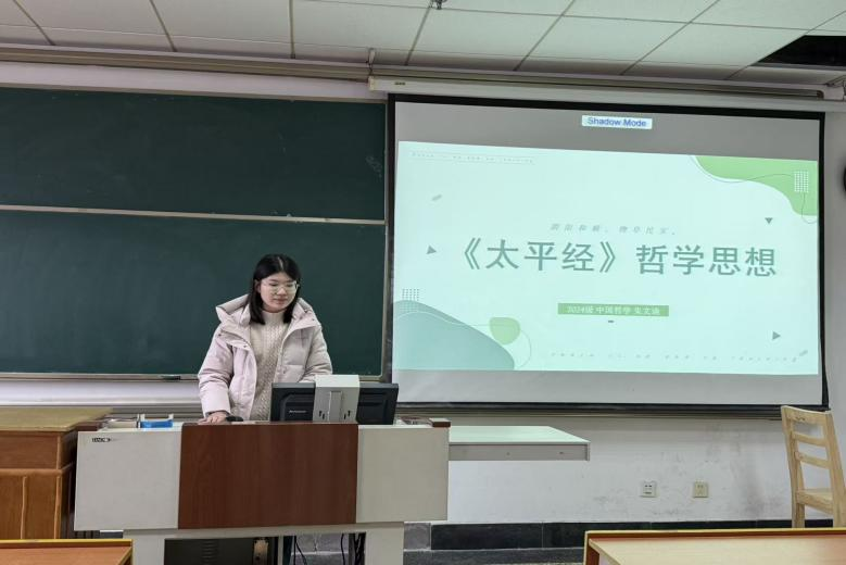 24级朱文迪同学以《太平经》为研读对象,她介绍了该经中“承负说”与“善恶报应”理论的基本内容,阐述了其在汉末社会动乱中的宗教与社会功能。她结合文本与历史语境,探讨这一观念在宗教伦理与社会教化中的功能,并反思其在当代道德建设中的启示价值。