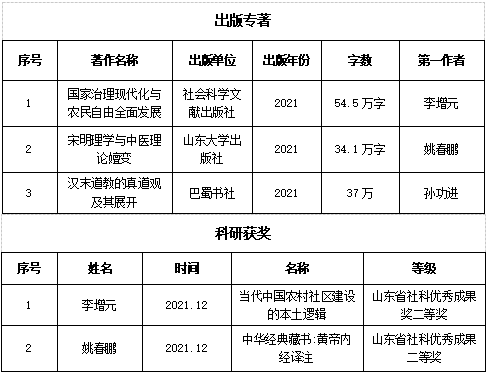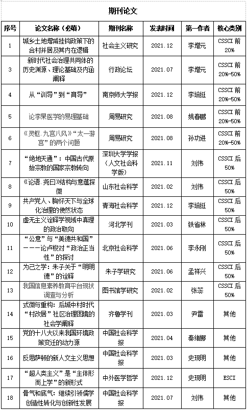 2021年度色情论坛 教师共获批国家社科基金项目1项,省部级项目3项;学院教师在《社会主义研究》、《行政论坛》、《周易研究》等CSSCI核心期刊发表学术论文18篇,出版专著3部,获得省级社科奖励2项。