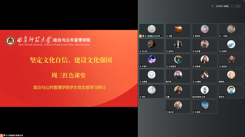 学生党支部于6月28日开展“周三红色课堂”活动,集中学习研讨习近平总书记在文化传承发展座谈会上的重要讲话精神。本次学习活动由学生党支部书记耿晓敏主持,支部全体党员通过腾讯会议线上参会。