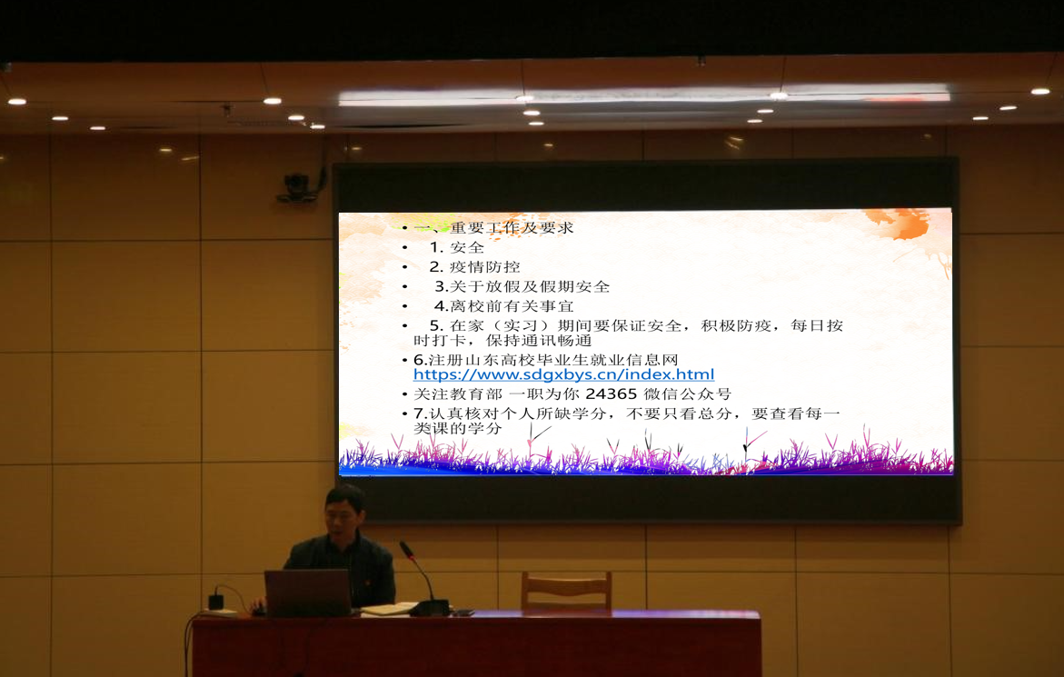 大会围绕学生安全、疫情防控、离校事宜、实习事项及征兵工作五大方面展开,王元如首先强调同学们应时刻注意人身安全,增强安全意识、提高防护能力,保护自己与他人生命安全。他还指出同学们要始终绷紧疫情防控之弦,在学院疫情形势常态化管控之下准备离校及假期工作安排,同时在家期间保持通讯畅通,确保联系到人。班会结束之际,王元如还向同学们详细介绍征兵工作相关通知,鼓励同学们根据实际情况投笔从戎、参军入伍,为国家国防建设贡献青春力量,并以“记安全、命第一;守纪律、不晚归;按节奏、不焦虑;勤锻炼、心放宽;强信念、热爱党;位互换、舍和睦;有诉求、善表达;防疫情、常态化”八条简语总结此次大会。