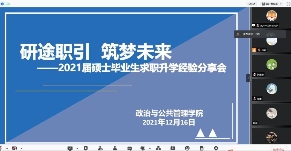 开展以“研途职引,筑梦未来”为主题的优秀硕士毕业生求职升学分享交流会活动,本次会议邀请2021届优秀硕士毕业生张蕴睿、铁小茜、李娜、徐萌分享个人求职升学经验,会议由研究生辅导员徐莉主持,色情论坛