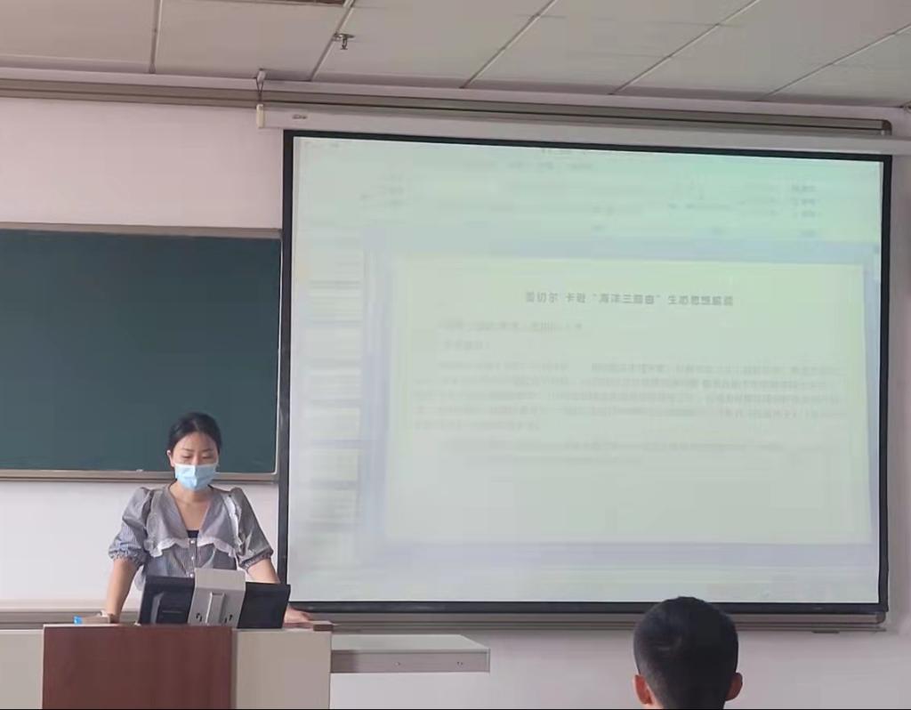 随后,2020级李秀娟同学就蕾切尔·卡逊的《海洋三部曲》进行了分享。《海洋三部曲》以海洋为场景,以海洋生物为中心,倡导尊重自然、敬畏生命等可持续的整体生态主义思维方式,抨击了以人类为中心,随意践踏海洋生态环境的行为和做法。她认为人们应负起生态伦理责任,转变以人类为中心的价值观和生活方式,认同自然万物的价值,从而实现生态自我,开创生态文明新模式。