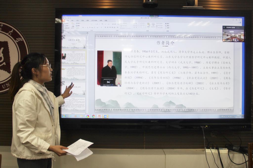 首先,2020级李悦宁同学为大家分享了扬雄的《法言》。她讲道,扬雄人性论所关注的,是作为社会个体的个人何以可能成为一个道德完美的君子,进而向圣人的目标挺进。扬雄承认人后天转化的可能,使圣人成为可以达到的目标,这就把为善成圣的希望给予更多的人。