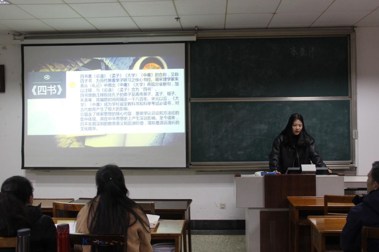 随后,2020级李悦宁同学分享了朱熹的《四书章句集注》,朱熹认为,读《四书》,应从《大学》开始,并把《大学》分为经、传两个部分,其中经文讲诉了《大学》中的“三纲领”“八条目”。在朱熹思想的影响下,以后的儒者都纷纷把“格物”或“格致”作为自己思想进程的出发点。对格物、致知的强调,是朱熹对中国哲学乃至对整个中国传统文化最重要的贡献之一。