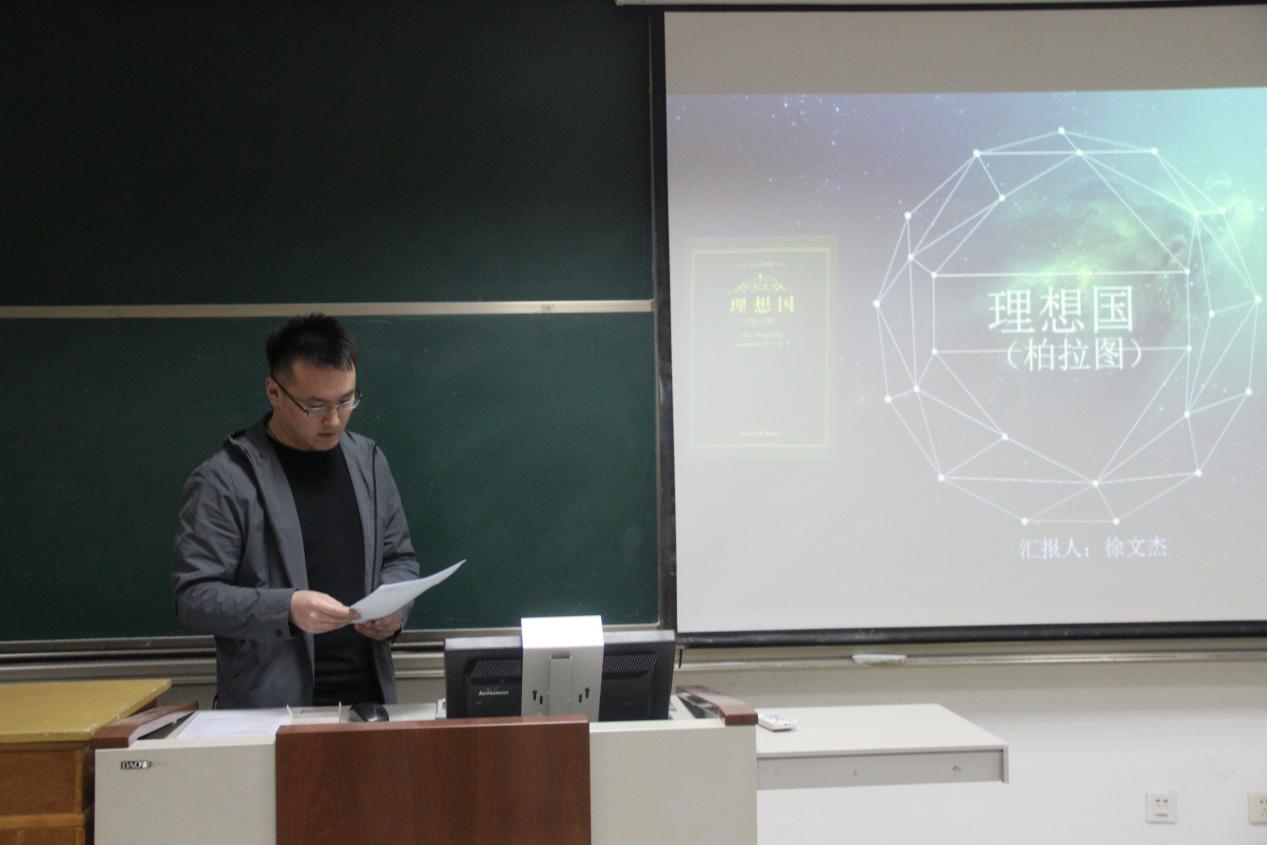 本期政研论坛读书交流会围绕伦理学相关专业书目及人物思想展开讨论。2019级徐文杰同学为大家分享了柏拉图的经典作品《理想国》。主要为大家讲述书中第五卷关于共产共妻与相亲相爱的一家人的内容。首先理想国阶级中承担守卫者角色的人是为了全体公民的最大福祉和实现城邦良好秩序和幸福的重要存在。其次,从共妻制度和优生学的角度说明了要以最好的品质来抚育下一代,实施这样的措施才能更好地治理国家。最后,从家庭和国家两方面表述了每个家庭都要和平相处相亲相爱受人尊敬,对于一个国家而言要团结一致,从而实现国家利益的最大化。
