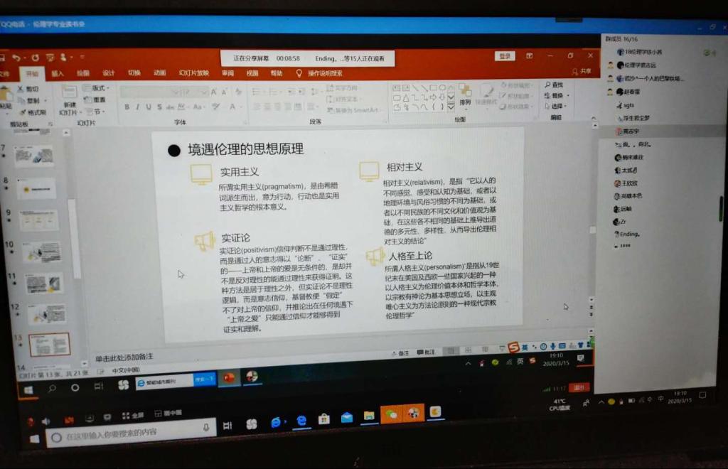 政研论坛第十三期伦理学专业读书交流会通过线上视频的方式如期召开。我院赵春雷副教授受邀参加本次读书会,2018级、2019级伦理学硕士研究生积极参加。