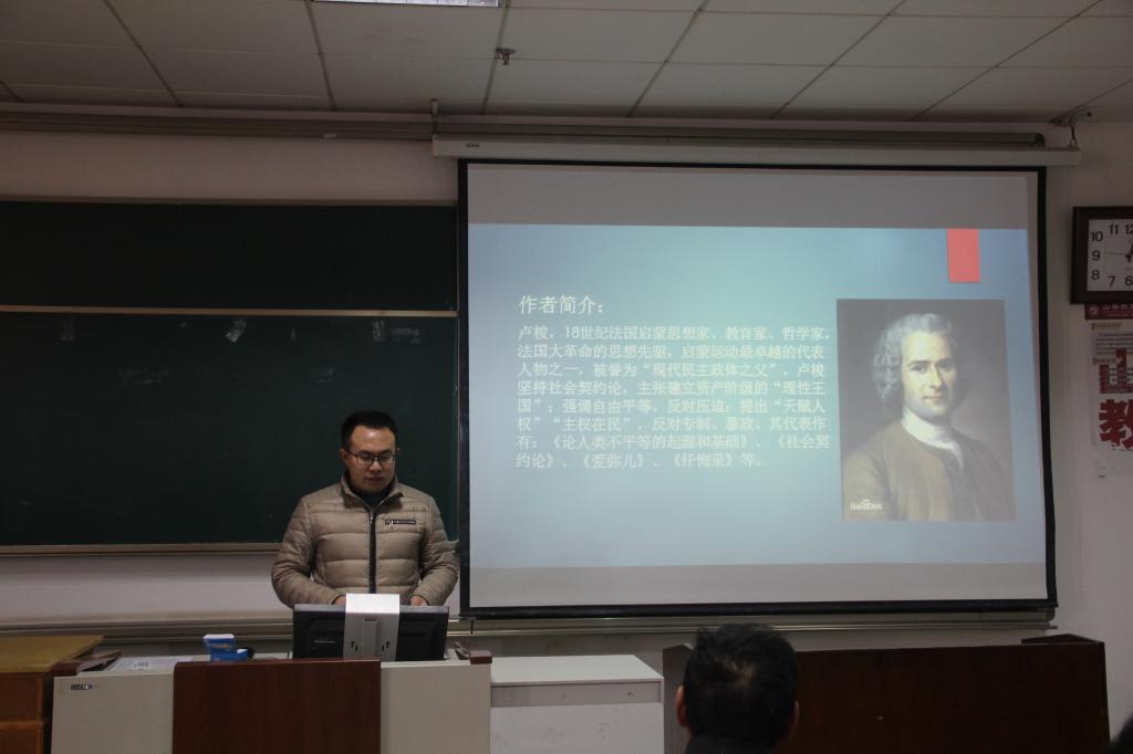 2019级李德政同学向大家介绍了《社会契约论》这一著作,他重点讲解了人类社会的不平等发展所经历的三个阶段:第一阶段是社会混乱与冲突;第二阶段是富人为了保障自己利益,诱骗穷人和他们一起制定法律,建立国家;第三阶段是政府权力逐渐腐化败坏,合法权力变成专制权力。
