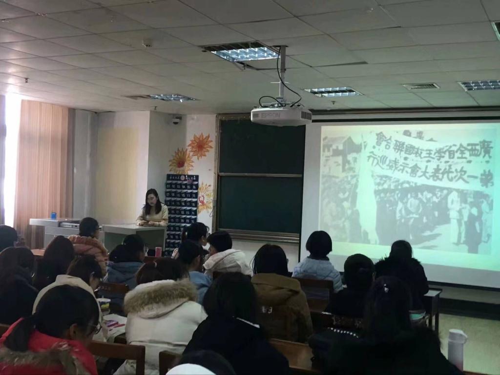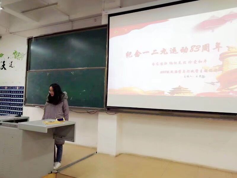 11日,公共政策班与政治学与行政学二班也于A302教室相继展开以“一二·九”运动为主题的团日活动。公共政策班团支部书记付丽惠以“纪念一二九先辈,弘扬新团员精神”为线索,首先向团员们介绍团务知识“十知道”,对共青团知识进行整合性讲解,帮助同学们更好地了解共青团员的权利与义务,从而形成对共青团的具体系统的认识。随后,付丽惠与各位团员共同回顾“一二·九”运动,加深了对其的了解并体味了崇高的爱国情怀。而政治学与行政学二班的各位团员自觉积极搜集“一二·九”运动的相关资料,为活动开展作出充分的准备,团支部书记王梦阳则以“纪念一二九运动83周年——勿忘国耻 缅怀先烈 珍爱和平” 为主题,从运动介绍,运动背景,运动过程,运动口号,运动意义五方面展开,进行生动详细讲解,同学们认真聆听,积极互动,踊跃发言,分享感受。