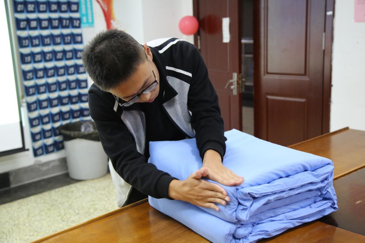 活动伊始,学生会主席孙文昌发表讲话,他指出,叠被子是养成大学宿舍生活好习惯的最基本的方式,更是展现学生文明卫生素养的重要途径,希望大家能够在本次比赛中收获叠被的乐趣,体悟内务整理的意义。随后,一曲舞蹈串烧拉开了比赛的序幕。在主持人简要介绍比赛流程后,2018级代表孙文昌、姚刚和2019级代表张芳玲、陈孟茜首先进行叠被子展示,他们一铺二折三捏,不放过任何细微之处,其叠被成果获得了现场的热烈掌声,将比赛紧张激烈的气氛调动了起来。紧接着,比赛正式开始。参赛选手共分为八组,每组四名同学需要在5分钟时间内将打散的被子叠成棱角分明、表面平整、中间不空、上下厚度匀称的“豆腐块”,并由评委进行打分。悠扬动听的歌曲演唱和别出心裁的趣味游戏穿插在比赛期间,将比赛气氛再次推向高潮。