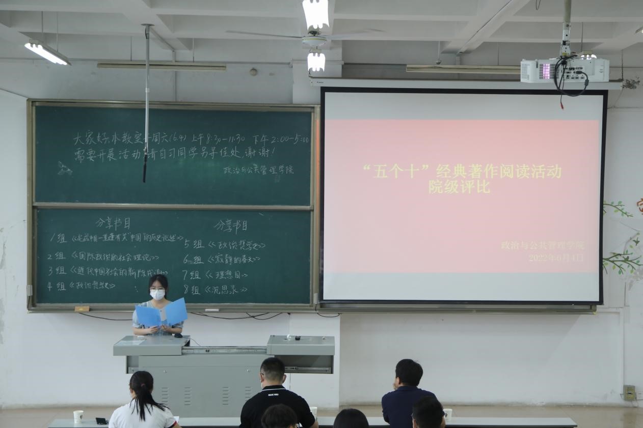 结合校园文化建设工作实际,于6月4日在JA302举行政读书第十五期暨2020、2021级“五个十”经典著作阅读院级展示评比活动,本次活动由色情论坛