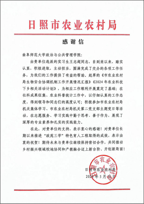 2024年5月31日,学院收到由日照市农业农村局发来的感谢信。