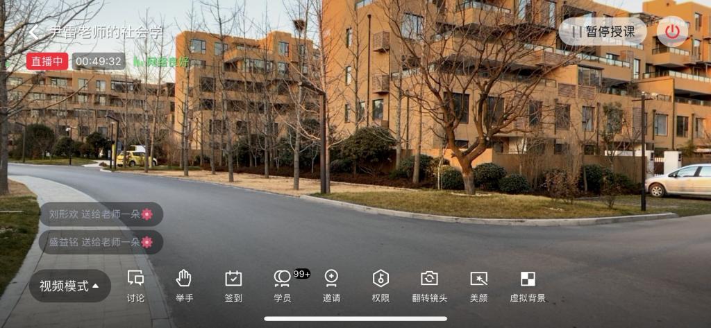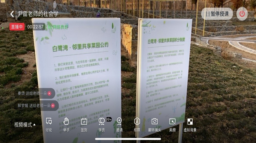 尹雷老师采用线上直播的形式,以白鹭湾海棠湿地小区为例,为同学们讲述关于城市社区的相关知识点,在授课过程中引入“沉浸式参与治理”、“人改变环境,环境改变人”等新型社区治理理念,让学生们感受到在新时代新发展格局下城市社区充分发挥自治功能、打造独特社区文化的实践样板。