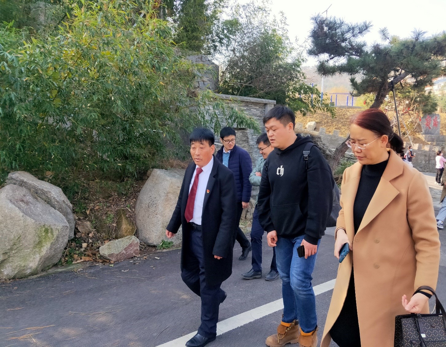 百泉峪村村党支部书记、村委会主任方国明应邀为同学们介绍村庄发展历史。首先,方明国书记结合亲身经历和工作历程,分享了村庄发展演变的过程。尹雷老师在方书记的带领下,通过第一视角将所见所闻传递给学生,边听边走边讲解,实时解答同学们的疑问,引导学生自主思考。