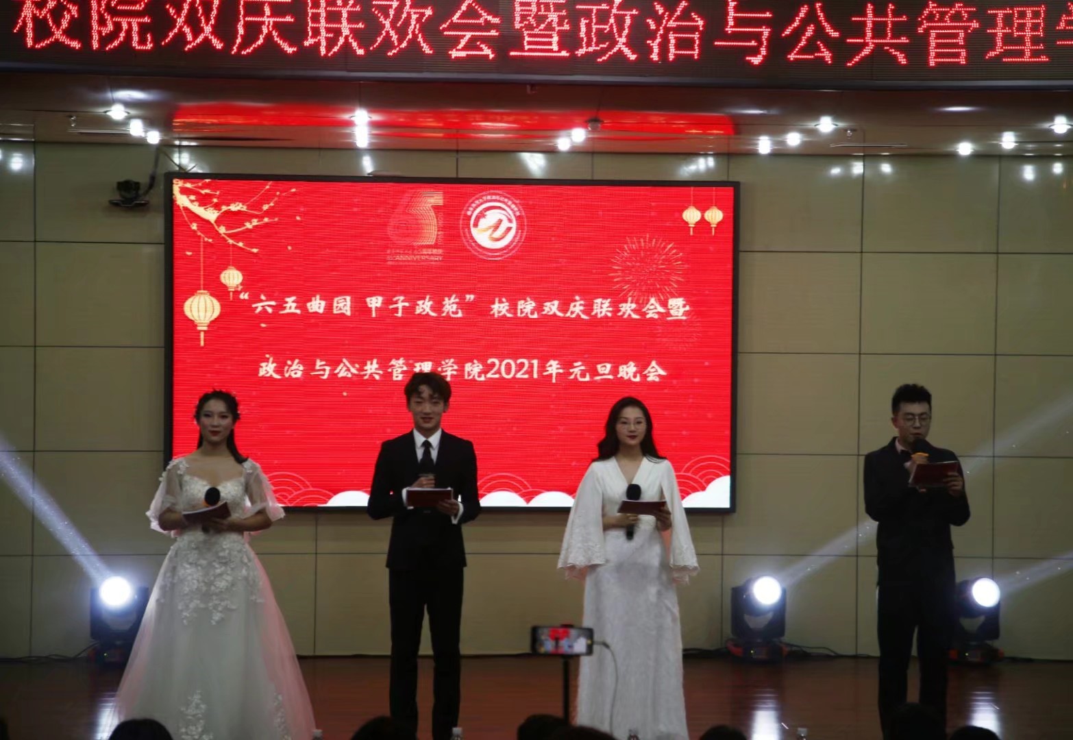 2021年元旦晚会于图书馆报告厅举行。学院团委书记王元如、研究生辅导员徐莉、2020级辅导员耿晓敏莅临参加,各院学生会主席、往届社团负责人及主席团、部分校外社团活动单位领导人员受邀出席,20级全体研究生和本科生参与观看。
