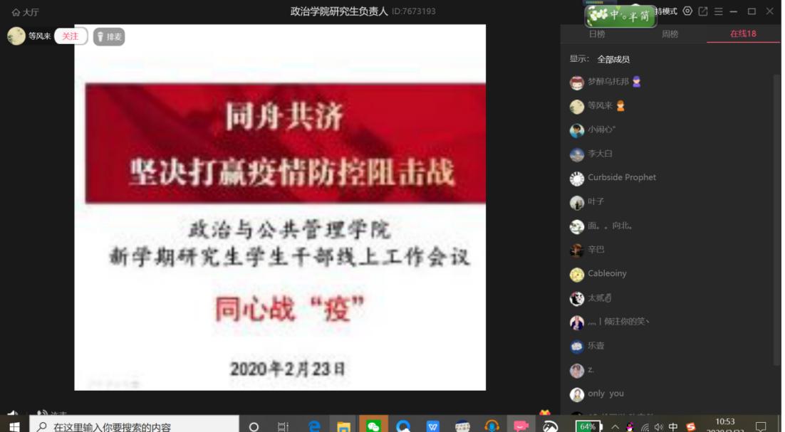 召开新学期研究生学生干部线上工作会议。本次会议,进一步强化学生干部在疫情防控期间的责任意识,引导学生干部以身作则,有效发挥在抗疫防控、科研学习、日常生活及精神风貌等方面的表率作用,做好新学期线上上课的秩序维护,协同配合学院完成新学期的各项工作安排。