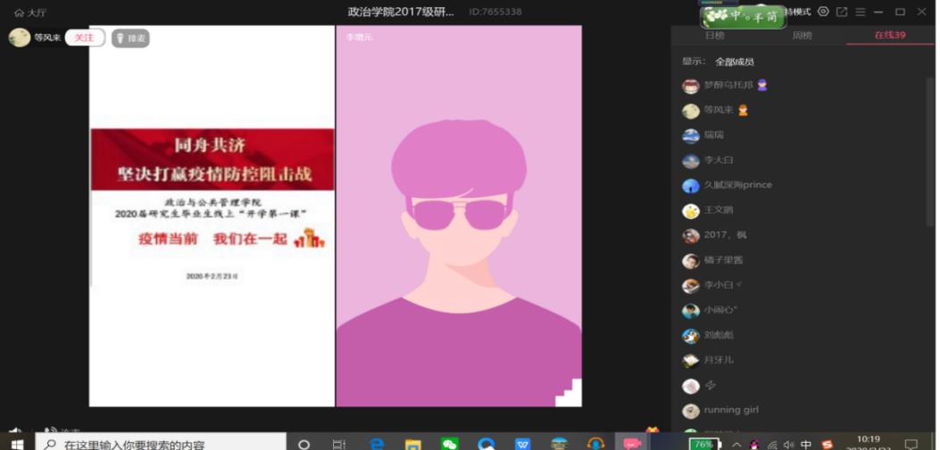 召开2018级、2019级研究生新学期线上会议,就疫情防控、新学期学习安排及研究生线上课程学习等工作进行安排。会议强调,全体研究生应遵守学校纪律,积极配合学院防控工作的要求及部署,调整心态,理性看待疫情,增强社会责任感,积极传播正能量;引导研究生居家静心研学,加强学术科研能力,多方面汲取专业知识,开拓学术视野;快速进入学习状态,养成良好的作息习惯,遵守线上课堂纪律,提高自律能力,做到在家如在校;积极联系导师,做好新学期规划。